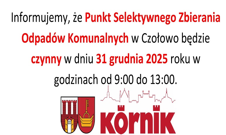 Informujemy, że PSZOK (Punkt Selektywnej Zbiórki Odpadów Komunalnych) w dniu 31.12.2025 roku będzie czynny w godzinach 9:00 do 13:00